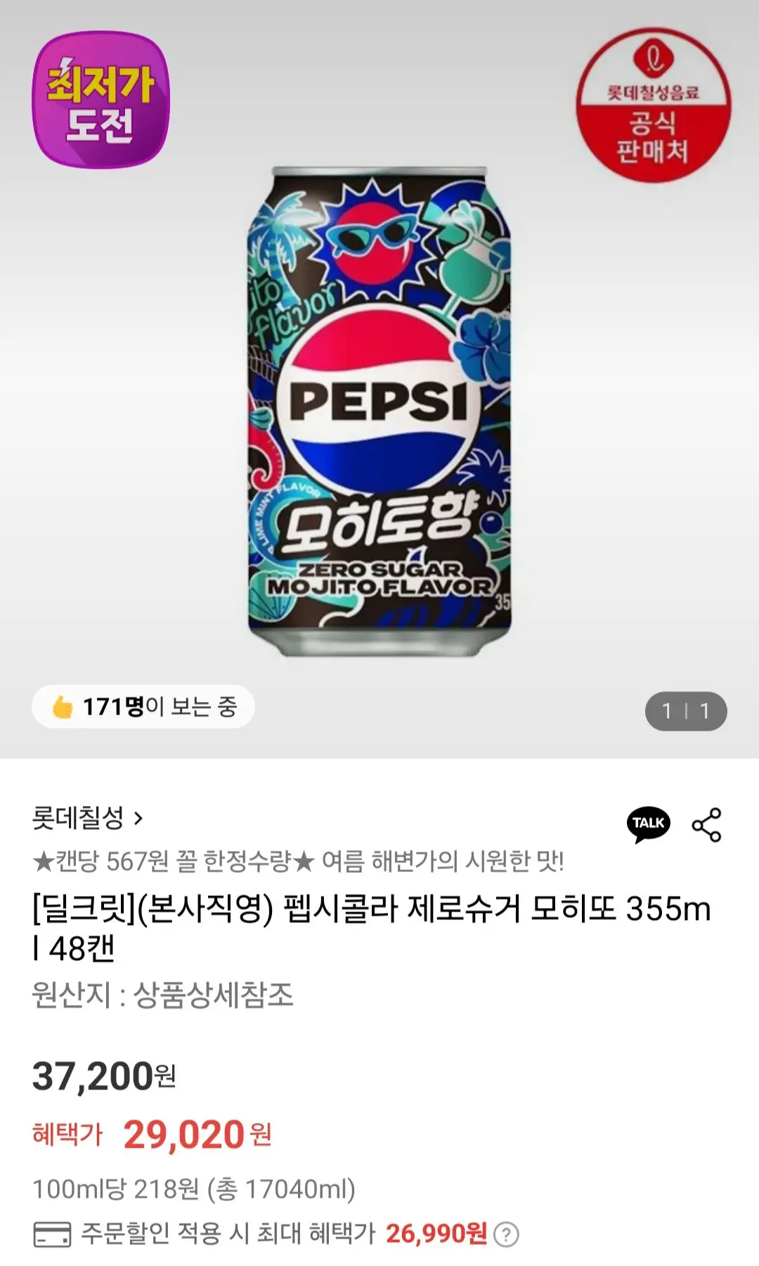 [롯데온] 펩시콜라 제로슈거 모히또 355ml 48캔 (26,990원) (무료)