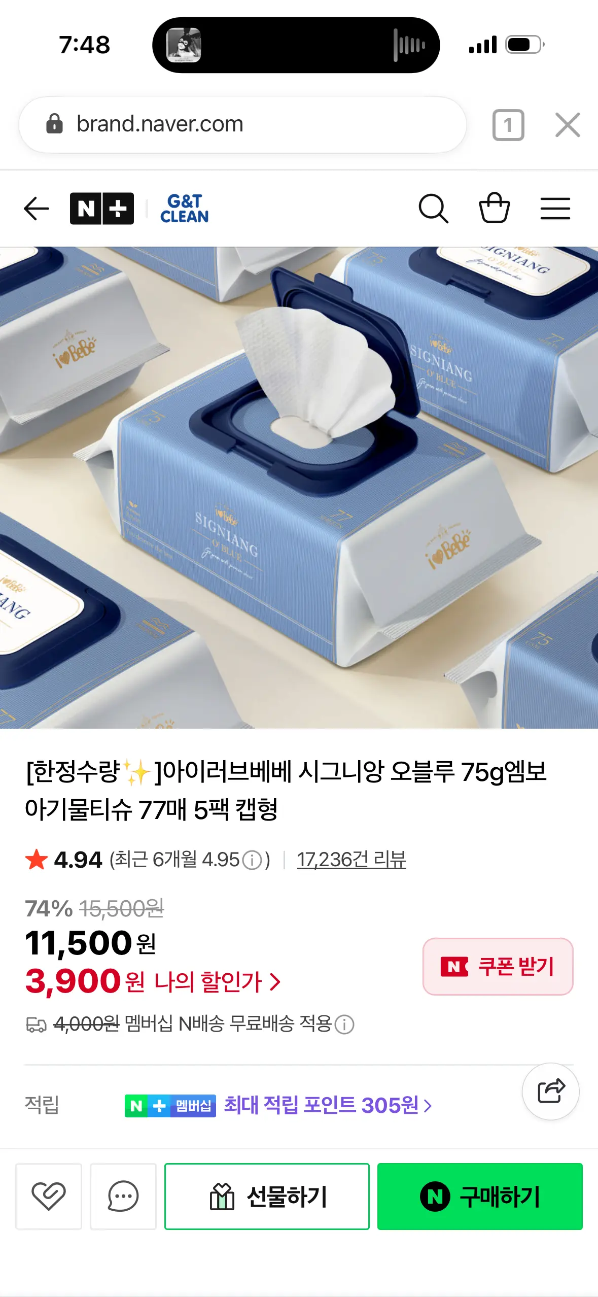 [스마트스토어] 아이러브베베 시그니앙 오블루 75g엠보 아기물티슈 77매 5팩 캡형 (3,900원) (네멤무료)